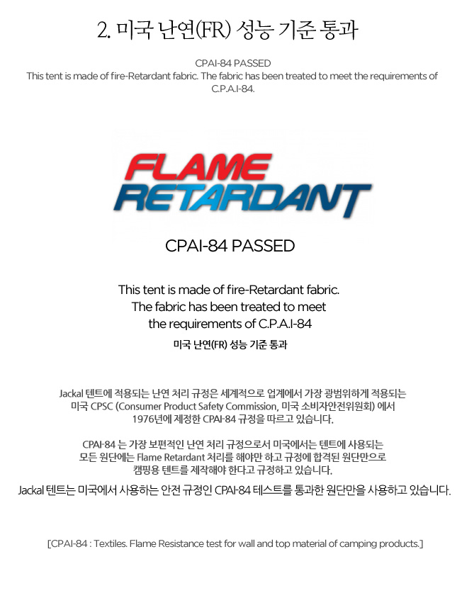 Jackal 텐트는 미국에서 사용하는 안전 규정인 CPAI-84 테스트를 통과한 원단만을 사용하고 있습니다.